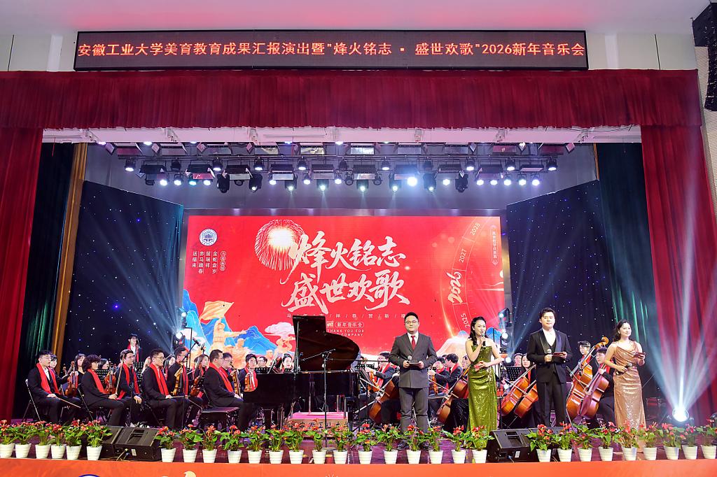 全校师生、各位校友:为纪念中国人民抗日战争暨世界反法西斯战争胜利80周年,用文艺宣演的形式积极营造健康高雅的校园文化艺术氛围,丰富师生精神文化生活,展示我校大学生美育教育成果,特在新年来临之际,举办安徽工业大学美育教育成果汇报演出暨“烽火铭志·盛世欢歌”2026新年音乐会。本次音乐会涵盖混声合唱、独唱、民乐、西洋乐、情景...