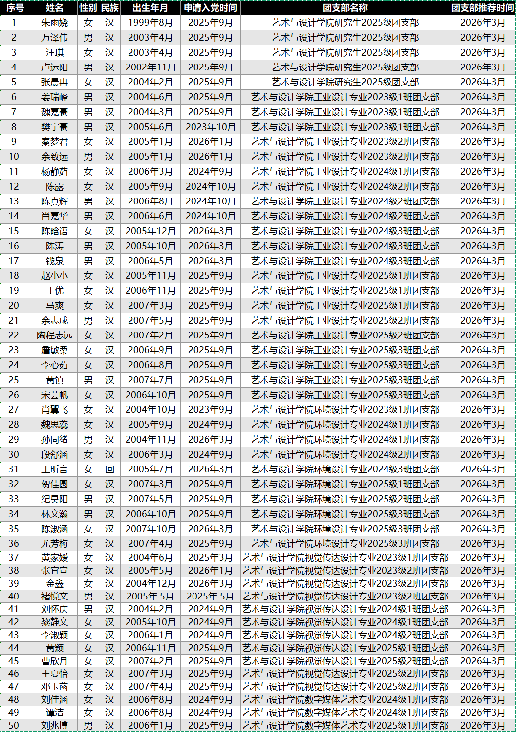 根据《共青团推优入党工作实施办法》要求,经过各团支部公平、公正、公开,民主推荐,院团委审核,现拟定向党组织推荐朱雨娆等50名同学作为入党积极分子,现予公示。