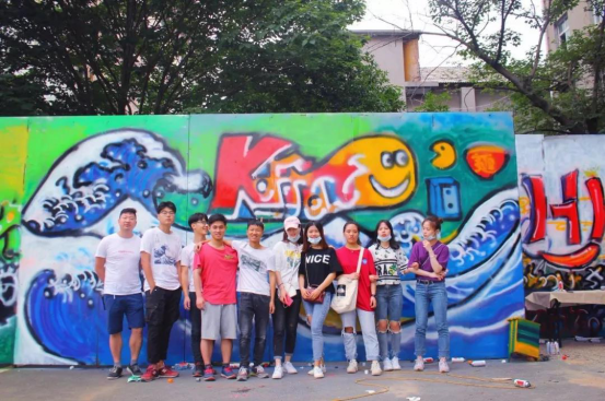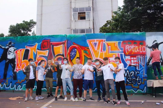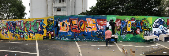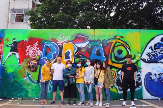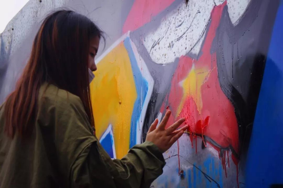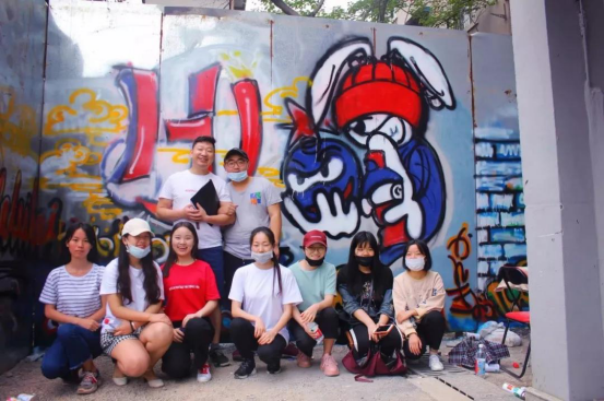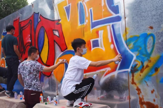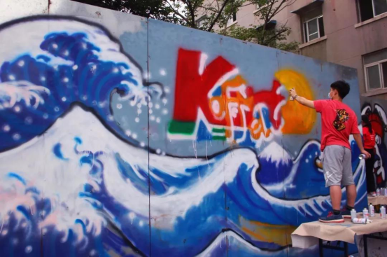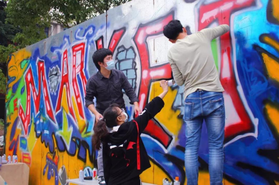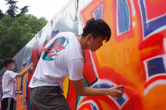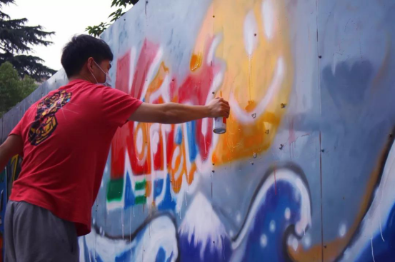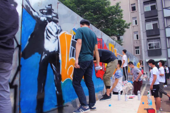 活动中同学们运用所学的形态构成专业知识表现出来独具特色的涂鸦色彩,他们通过现代的漫画涂鸦方式演绎文化,用绚烂的色彩在围挡上进行涂鸦创作,改变了原本斑驳的原貌,旧工业时代的建筑与现代气息的混搭,演绎成为一个文艺气息浓郁的地方。