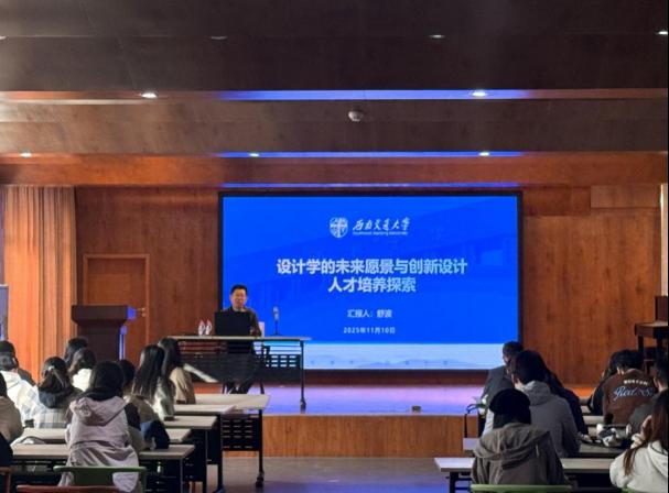 在人才培养方面,舒教授结合西南交通大学的教育实践,重点介绍了学校在“创新设计人才培养体系”建设中的探索经验。他强调,新时代的设计教育应以社会需求和产业创新为导向,构建“技术+人文+社会责任”相融合的培养模式,提升学生的系统思维、创造能力与社会感知力。他还分享了在科研项目、国际合作、课程改革等方面的实践成果,提出了设计学教育应“以设计思维引领未来,以创新能力服务社会”的发展理念。