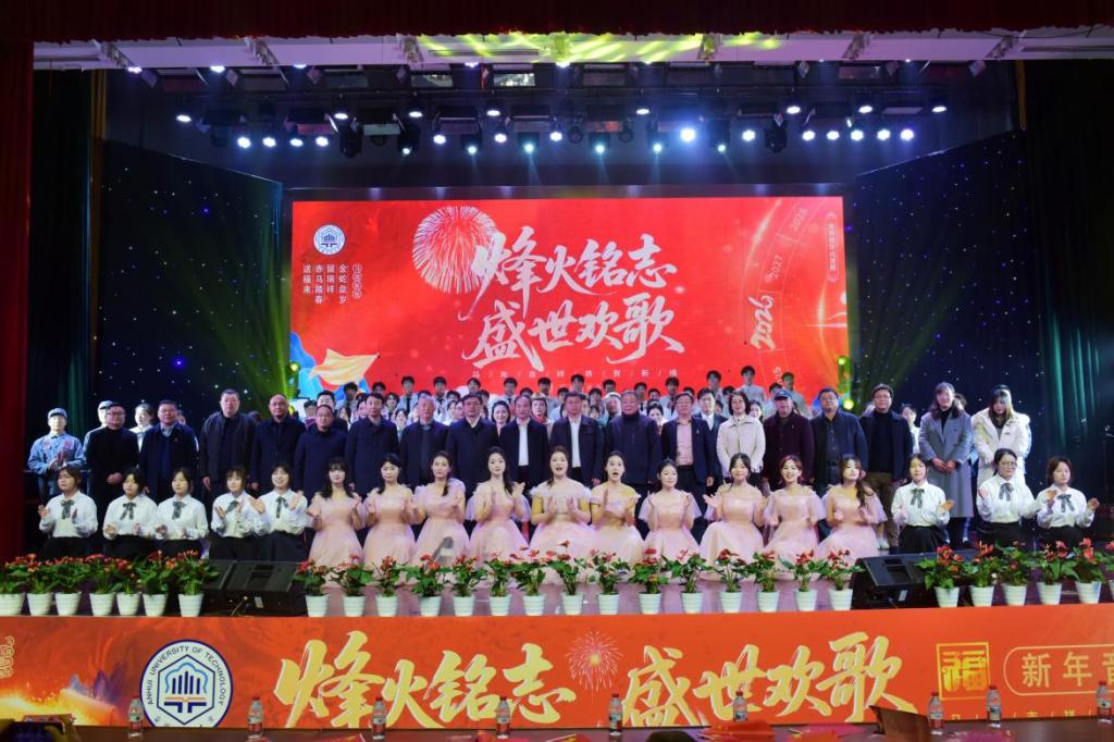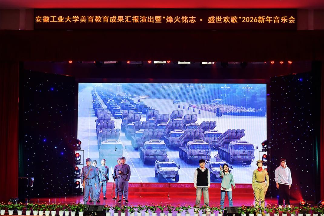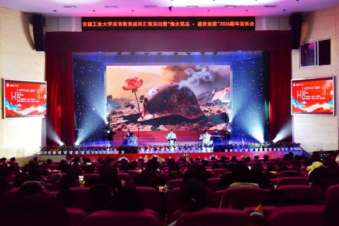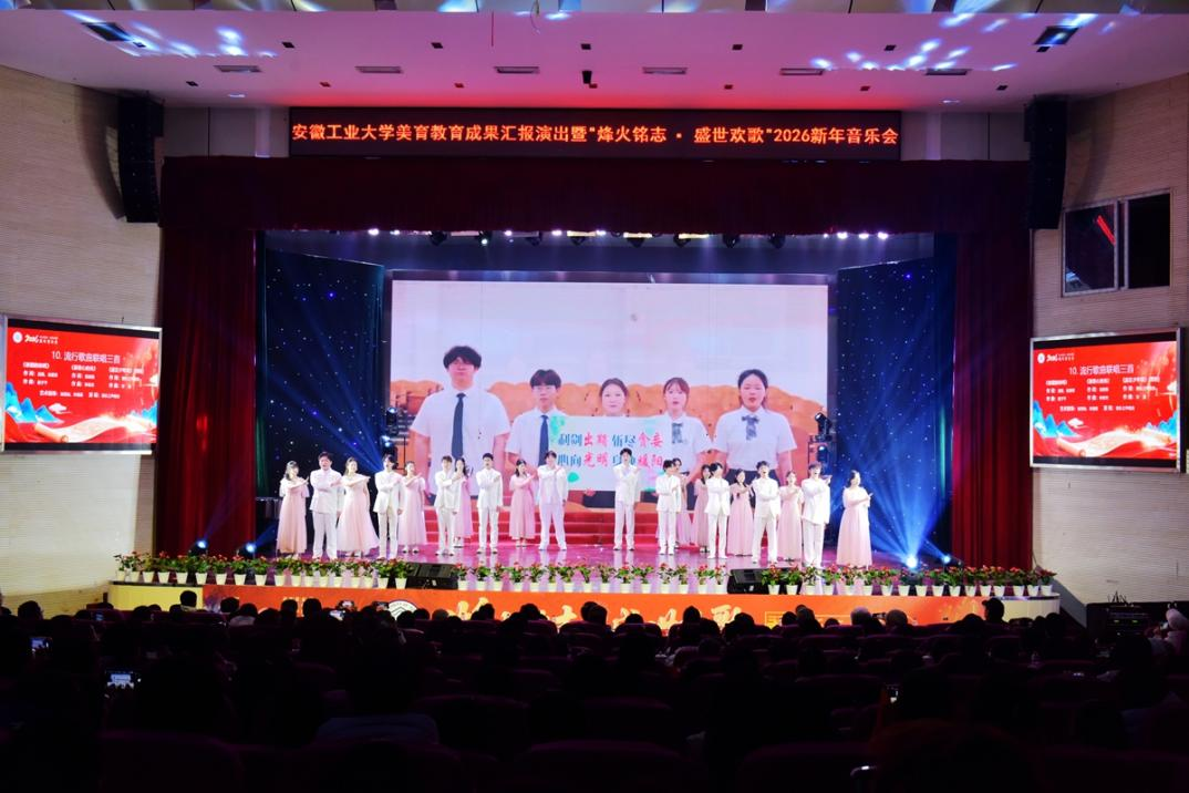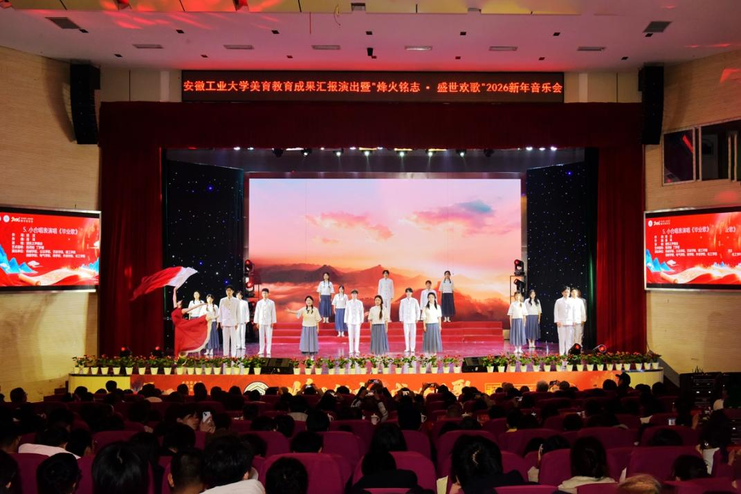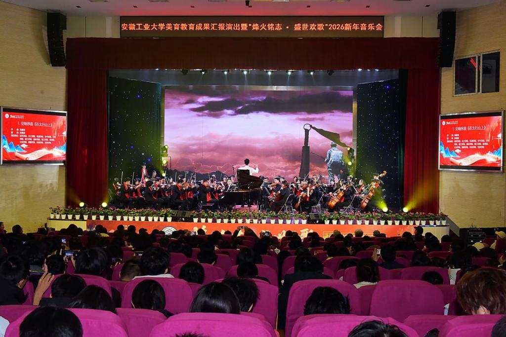 12月29日晚,由艺术与设计学院承办,党办校办、党委宣传(统战)部、团委、教务处、创新创业学院协办的安徽工业大学美育教育成果汇报演出暨“烽火铭志·盛世欢歌”2026新年音乐会在秀山校区新大学生活动中心浓情上演。校领导曾杰、王俊、郑啸、吴春雷、闵凡飞、郑利平、张世宏出席,校党委常委,相关职能部门、学院党政负责人、马鞍山市公安局相关负责人、兄弟学校音乐协会嘉宾、美育共建单位与优质生源基地中学代表以及师生代表共同观看音乐会。