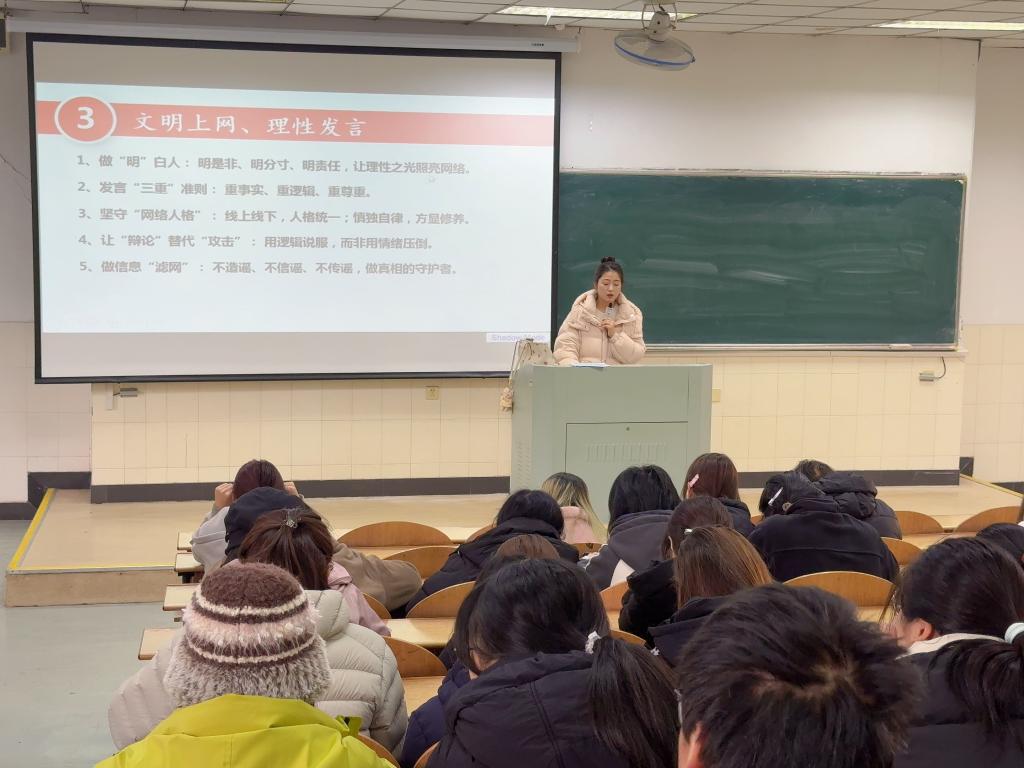 2024级辅导员汪正围绕校园日常管理、防范电信诈骗、学业预警机制等内容进行详细解读,引导学生合理安排大二学习生活,积极参与实践锻炼和校园文化活动,提升自我管理能力,夯实专业基础。